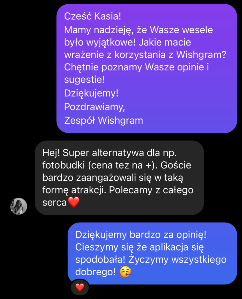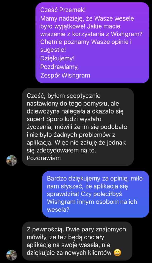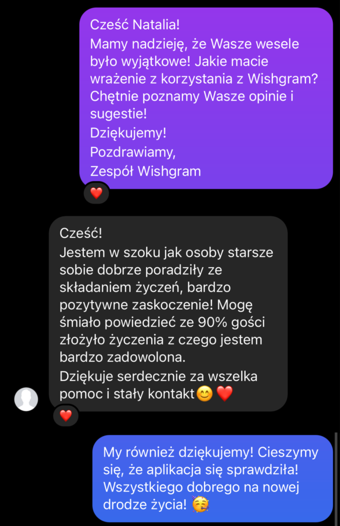 Pakiet Wishgram zawiera: platformę do składania życzeń, nielimitowana ilość życzeń, personalizację aplikacji, galerie zdjęć, przygotowanie e-booka, dostęp do plików przez rok po wydarzeniu.